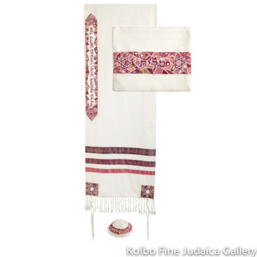 This tallit is hand-woven in the remote northern Pines Village in Israel. The set is finely woven with soft cotton into stripes of beautiful burgundy bands. Cotton 18"W x 64"L...